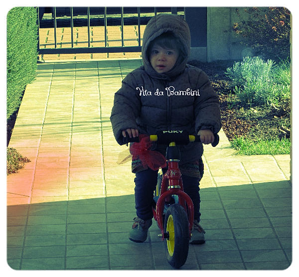 Giusto per ammortizzare la spesa abbiamo sfruttato la bici rossa sino al massimo della altezza di manubrio e sellino e poi siamo passati alla bici coi pedali (rigorosamente Puky, ma questa volta comprata di seconda mano!).